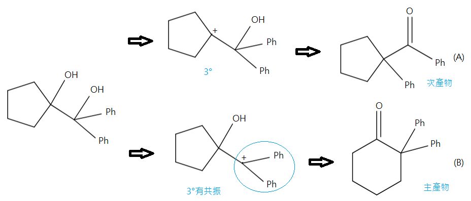 同樣是pinacol重排,但走(B)的C+會比走(A)的C+更穩定,所以答案選(B)