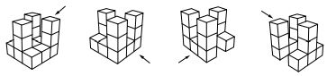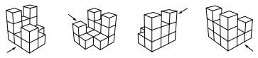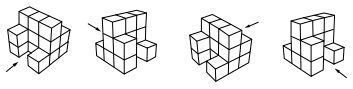 29. 建築師 Kiyoshi 為籌備在高雄的成果展,以每格 1 m 3 正立方體的大小,以 3 格× 3 格× 3 格 為最大範圍,提出四組立體雕塑作品的方案,其採用四個方向的等角圖(箭頭為前視圖之 觀察方向 ),如下( A )至 ( D )選項所示。今因場地與預算之要求,主辦單位規定每個作品 的體積至少不得超過14m3 ,則下列何者 不符合 要求?