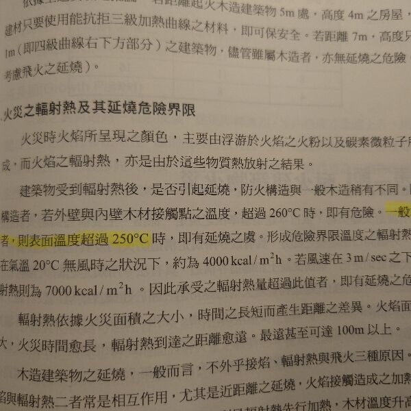 29. 建築物受到輻射熱後,是否引起延燒,對一般木造者,其表面溫度超過多少度時,即有延燒之虞?