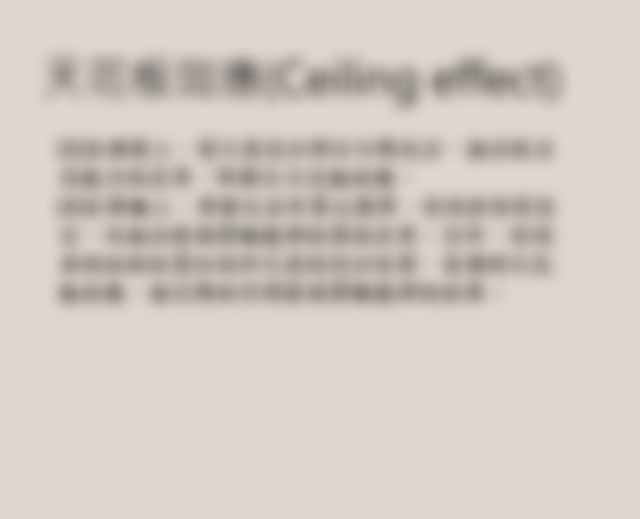 天花板效應又稱高限效應:當要求被試完成的任務過於容易,所有不同水平(數量)的自變數都獲得很好的結果,並且沒有什麼差別的情況時,我們就說實驗中出現了高限效應