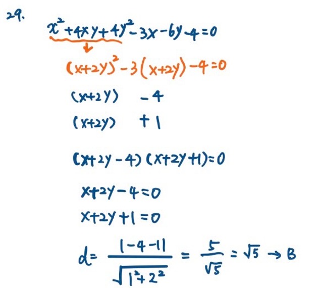 29. 若x2+4xy+4y 2-3x-6y- 4= 0之圖形為二平行線,則此兩平行線之距離為何?
