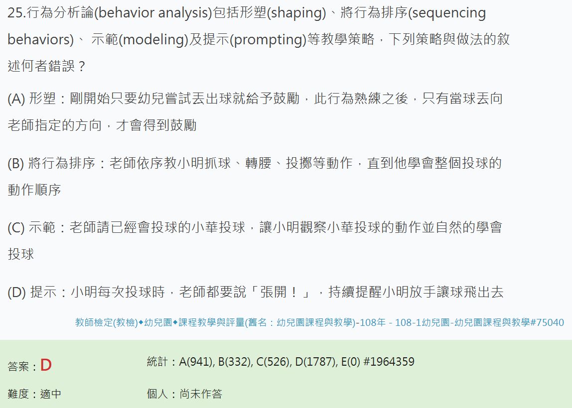 (A)形塑:剛開始只要幼兒嘗試丟出球就給予鼓勵,此行為熟練之後,只有當球丟向老師指定的方向,才會得到鼓勵
