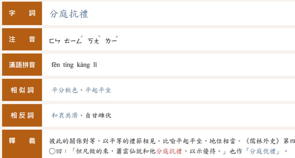 | 分庭抗禮 | 「抗」,典源作「伉」,對等、匹敵之義。 「分庭抗禮」指分處庭中,相對設禮,以平等的禮節相見。 比喻地位相當,或二者對立。 |