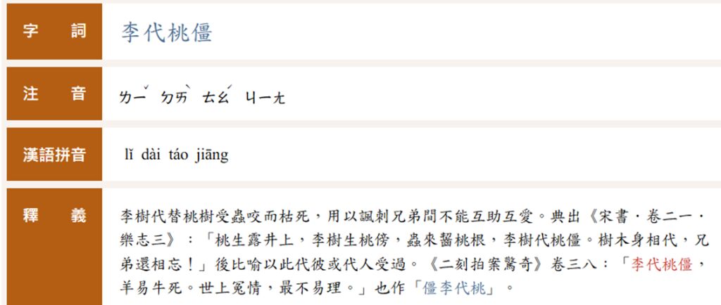 | 李代桃僵 | 李樹代替桃樹受蟲咬而枯死。語本樂府古辭〈雞鳴〉。後用「李代桃僵」比喻以此代彼或代人受過。 | 人應該要學習負責,你這樣李代桃僵地為他承擔責任,不是幫他,反而是害了他。 |