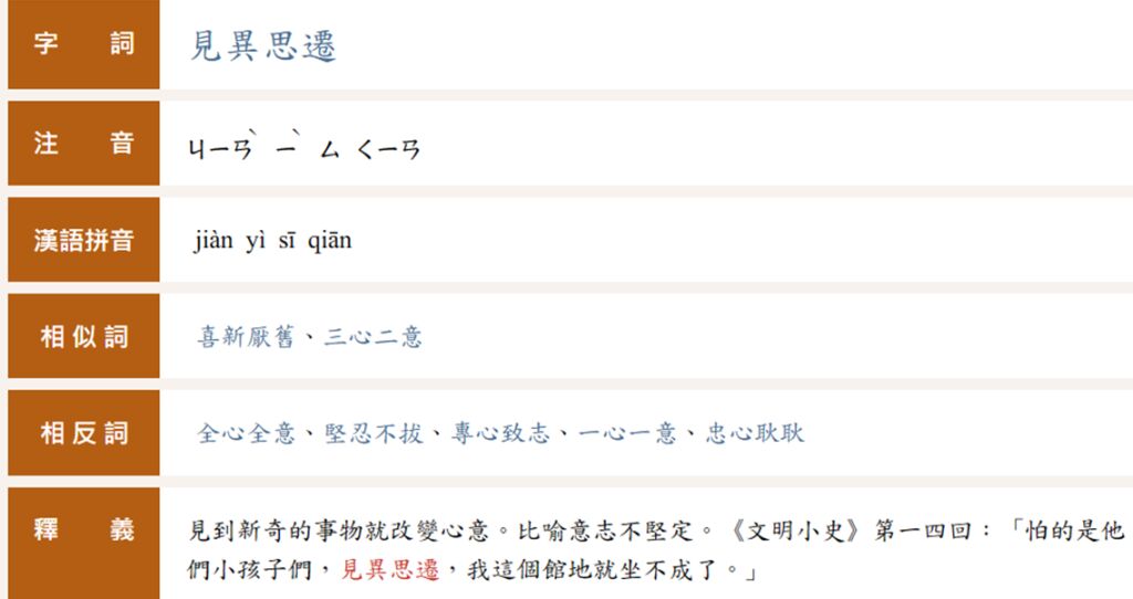 | 見異思遷 | 見到別的事物就改變心意,比喻意志不堅定。 | 要做好事情絕不能見異思遷,有句諺語說:「滾動的石頭不生苔。」就是這個意思。 |