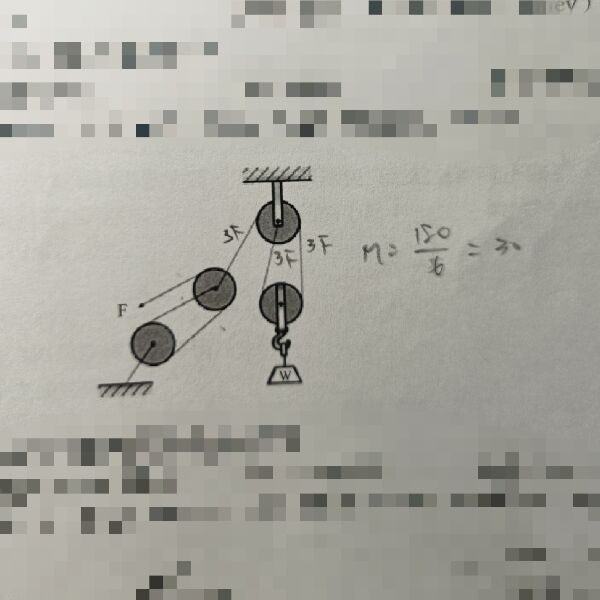 3 如圖所示之滑輪組,欲吊起 180 kg 之物重 W 時,則施力 F 最少需施加多少的力量?