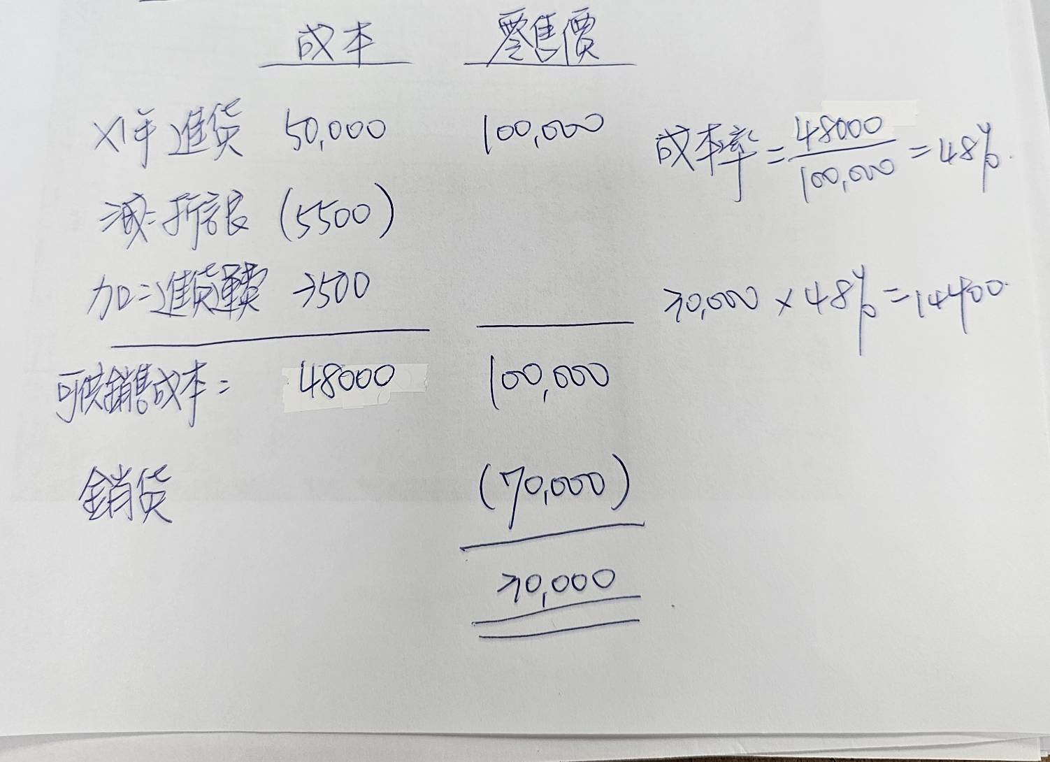 成本率 = 進貨成本48,000/進貨零售價100,000=0.48