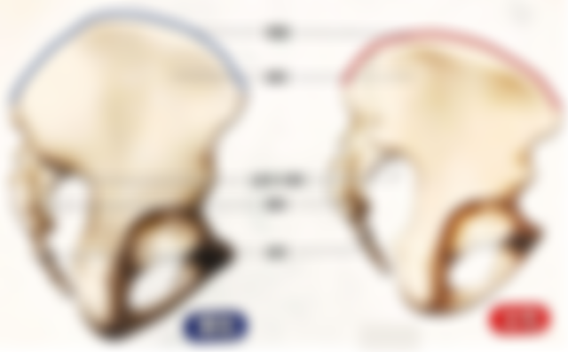 (B)骨盆的骨骼厚度:男性>女性