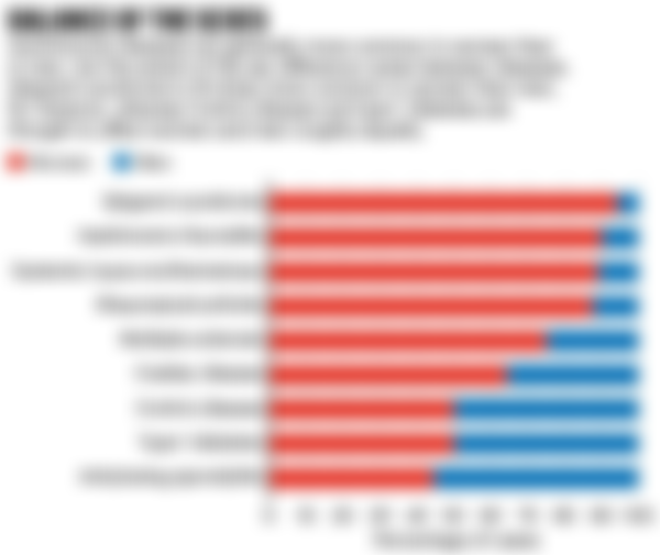 (C)第一型糖尿病(type 1 diabetes mellitus),女性的發生率較高