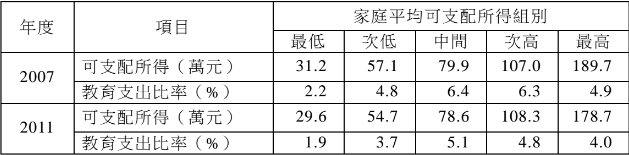 「家庭可支配所得」是指家庭在一年內的消費支出與儲蓄的總和,其中包括教育支出費用。下 表是某國2007及2011年的家庭可支配所得及教育支出占可支配所得之比率。依據下表判斷該國 的社會現象和發展趨勢,下列敘述何者最適當?