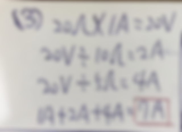 3. 三電阻並聯,其電阻值分別為20Ω、10Ω、5Ω,若流經20Ω之電流為1A,則總電流為多