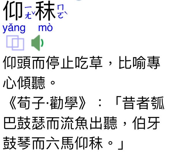 六馬仰秣:形容樂聲優美動聽,連馬都輟食仰首傾聽。《荀子.勸學》:「昔者瓠巴鼓瑟而流魚出聽,伯牙鼓琴而六馬仰秣。」漢.王充《論衡.率性》:「推此以論,百獸率舞,潭魚出聽,六馬仰秣,不復疑矣。」
