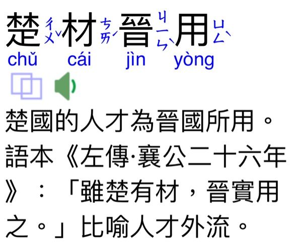 楚材晉用:楚國的人才為晉國所用。比喻本國的人才外流到別的國家工作。