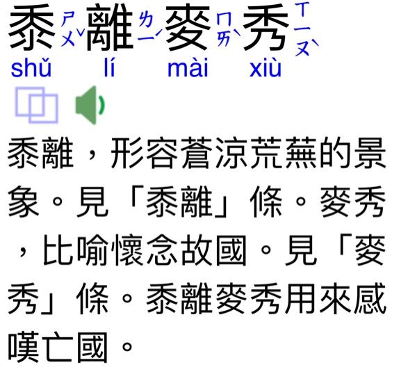 不恥下問:恥:羞恥。不以向地位學問比自己低的人請教,為羞恥,形容謙虛好學的品格。 黍離麥秀:哀傷亡國之辭。