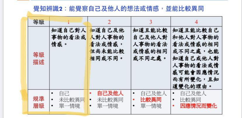 覺知辨識:能察覺自己及他人想法或情感,並能比較異同。