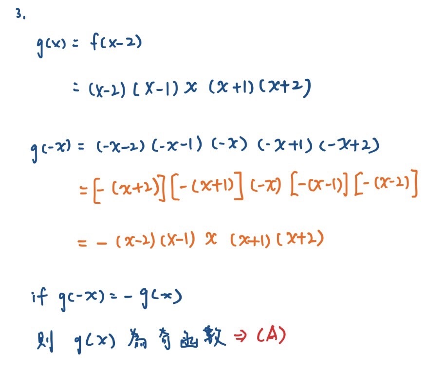 3. 已知f(x) = x(x + 1)(x + 2)(x + 3)(x + 4),試問函數g(x) = f(x − 2)的奇偶性?