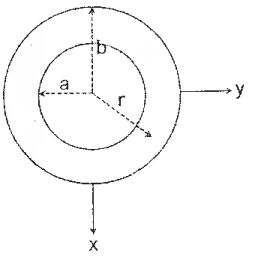 3.On the right is the cross-sectional view of a hollow and infinitely long conductor. The conductor is placed along the z axis and carries a current of 6 A in the +z direction. If the inner and the outer radii are respectively 2 cm and 4 cm (i.e. a=2 cm and b=4 cm), what is the magnitude of the magnetic field intensity at r = 3 cm?