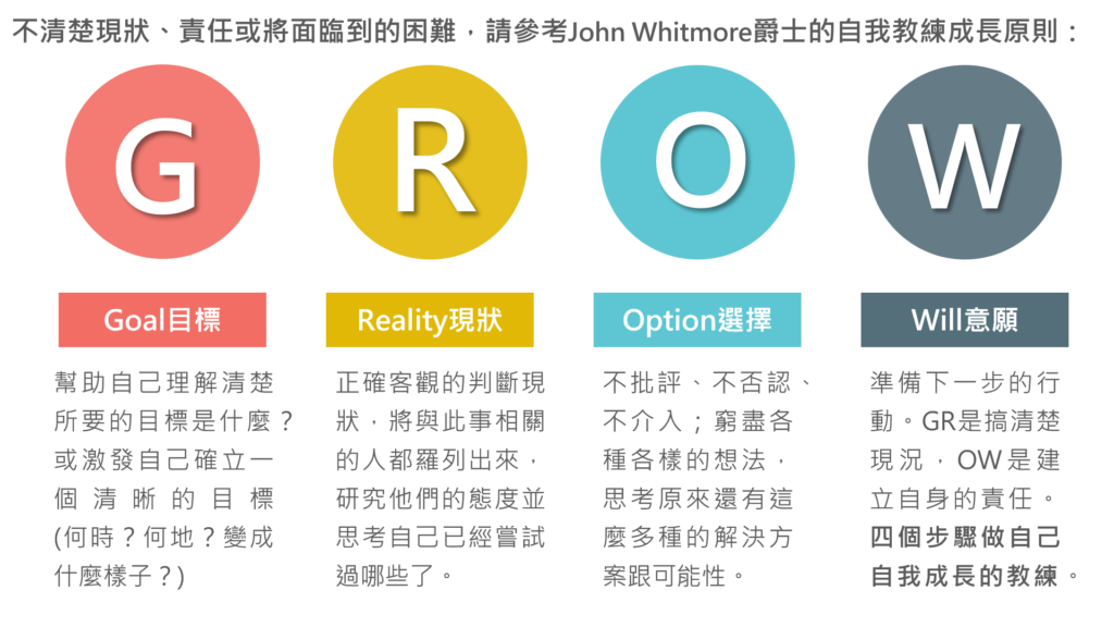 30、GROW 模式推薦四種類型的提問作為溝通的媒介,可促進溝通的效能。以下對 GROW 模式的描述何者是錯誤 的