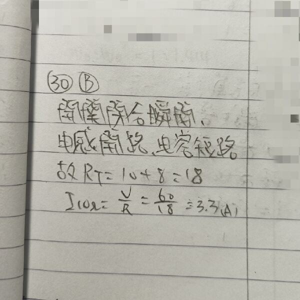 30 如圖,電容與電感都無儲存能量,當電路中開關S閉合瞬間,流過10Ω之電流為多少?