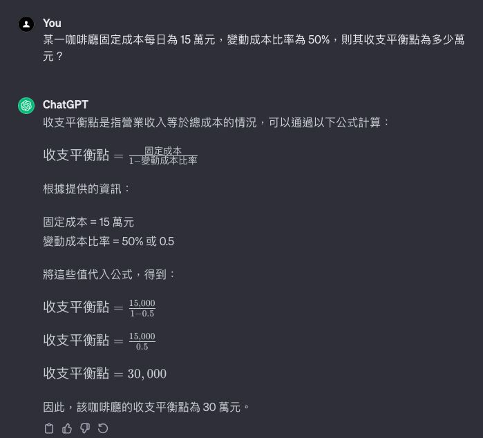 30 某一咖啡廳固定成本每日為 15 萬元,變動成本比率為 50%,則其收支平衡點為多少萬元?