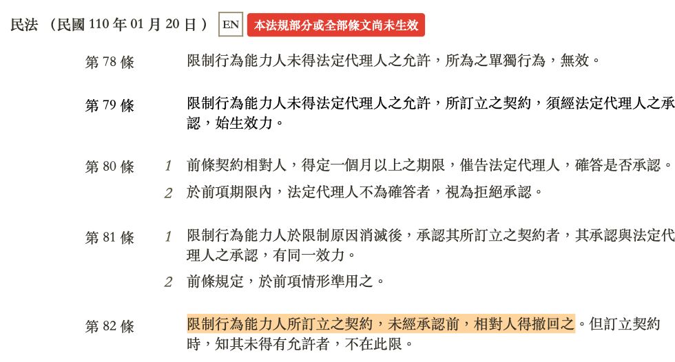 法理:依現行民法(2023 年起生效),滿 18 歲為成年。甲女 17 歲,屬於「限制行為能力人」(民法第 13 條第 2 項)。