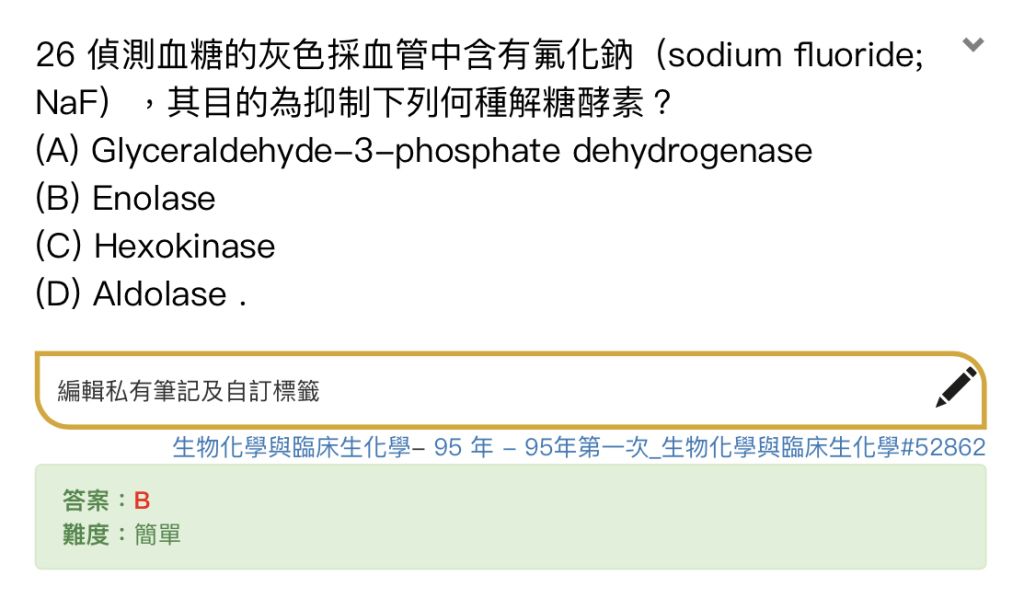 (B) enolase:被NaF(sodium fluoride)抑制
