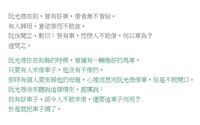 30. 「阮光祿在剡,曾有好車,借者無不皆給。有人葬母,意欲借而不敢言。阮後聞之,嘆曰:『吾有車而使人不敢借,何以車為?』遂