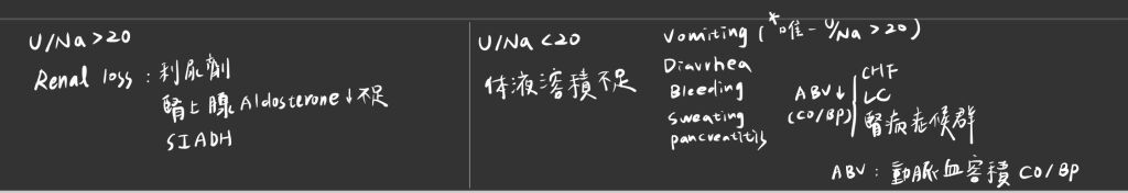 Na+:124 mEq / L,尿液 Na+:35 mEq / L。理學檢查皮膚尚屬濕潤,無水腫。甲狀腺功能