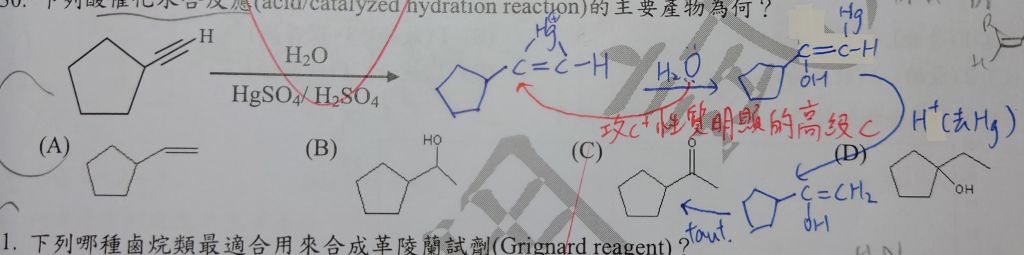 30. 下列酸催化水合反應(acid/catalyzed hydration reaction)的主要產物為何?