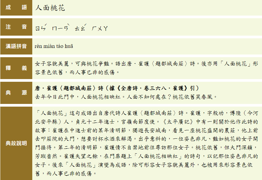 崔護在中進士前的某年清明節,獨遊長安城南,看見一座桃花盛開的農莊,他上前去叩莊院的大門,想要討杯水酒來解渴。出乎意料的,一位姿色非凡、豔如桃花的女子開門接待。第二年的清明節,崔護情不自禁地前往尋訪那位女子。桃花依舊,但大門深鎖,芳蹤杳然。崔護失望之餘,在門扉題上「人面桃花相映紅」的詩句,以記那位姿色非凡的女子。