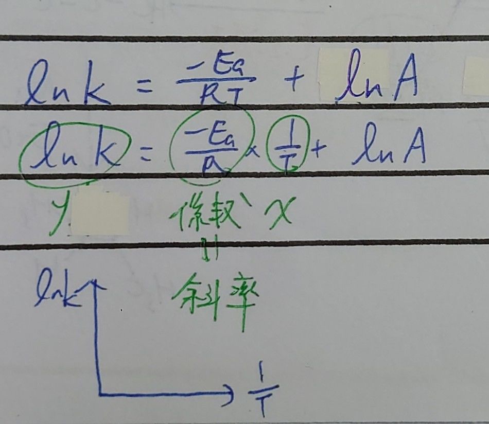 30. 利用阿瑞尼斯方程式(Arrhenius equation, k = Ae–Ea/RT),以 ln k 對 1/T 作圖,其斜率等於 。