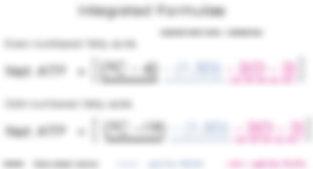 <e.g.>16個碳的棕櫚酸最後會形成8個Acetyl-CoA,7個NADH和7個FADH2解釋:每跑一次β-oxidation產生1NADH+1FADH2。而16個碳的棕梠酸酯只會跑7次β-oxidation,因為最後一次將4C→2*2C,不會再跑β-oxidation