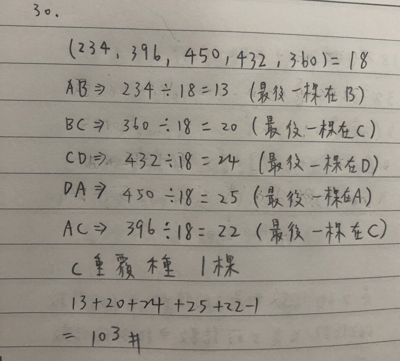 30. 右圖為公園各路徑長度示意圖,今欲規劃沿每條路徑取固定距離架設一盞路燈,且每條路徑交匯處皆需架設一盞路燈,則 至少需要購置幾盞路燈?