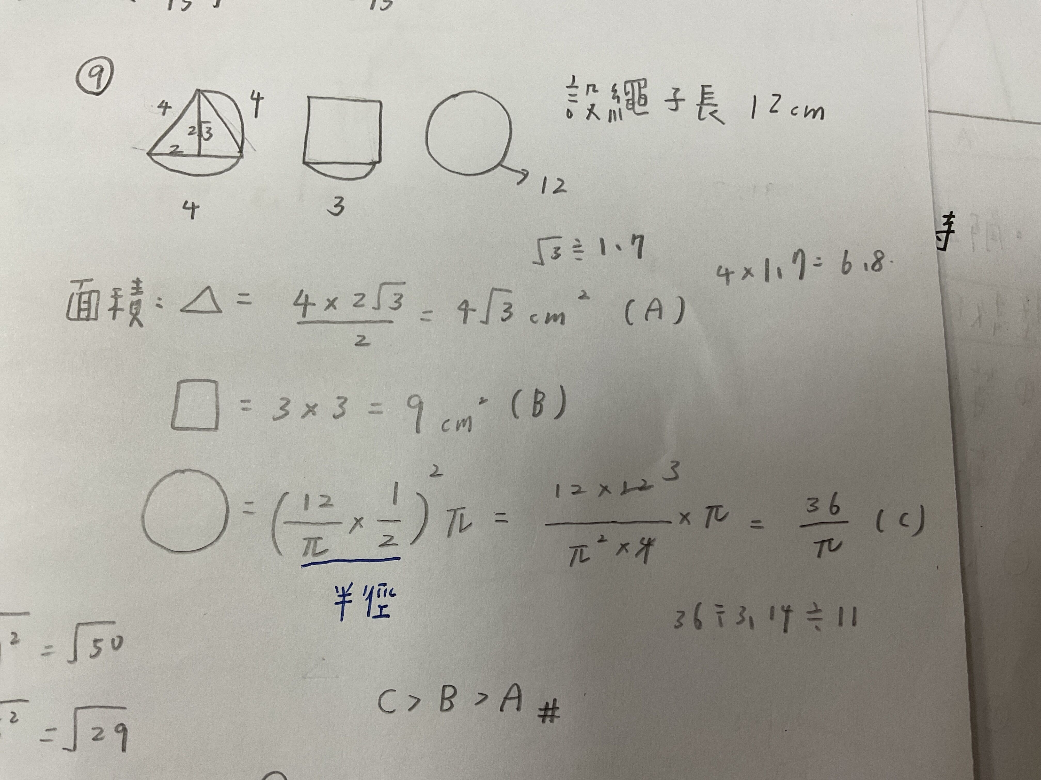 9.用三條長度相同的繩子分別圍成正三角形、正方形、圓形,所圍成的面積分 別為 A、B、C,則下列何者正確?