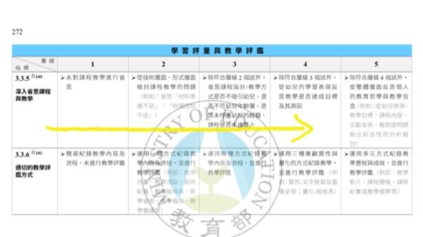 層級5 除符合層級 4 描述外,從整體層面反思個人的教育哲學與教學信念(例如:從幼兒表現、教學目標、課程內容、活動安排、教師提問歸納出綜合性的分析檢討)。