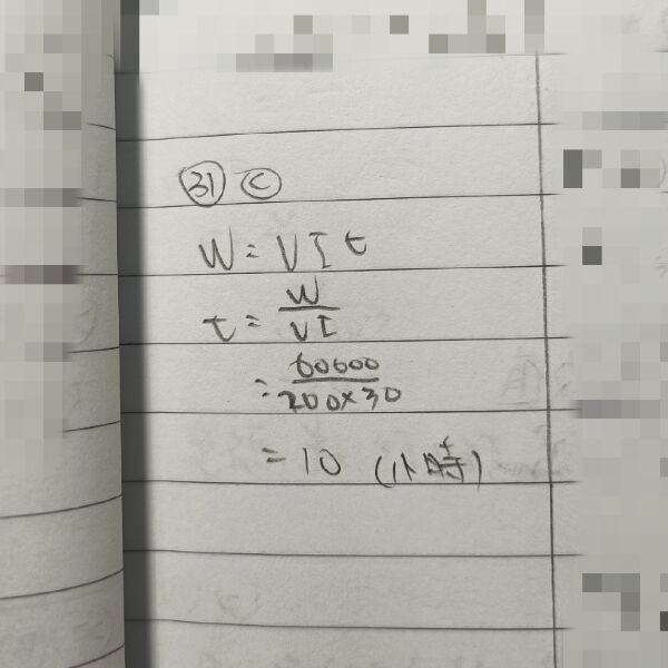 31 有一電動車之充電電池容量為 60 kWh,若有一標準充電器可提供 200 V、30 A 的電流,設初時,充