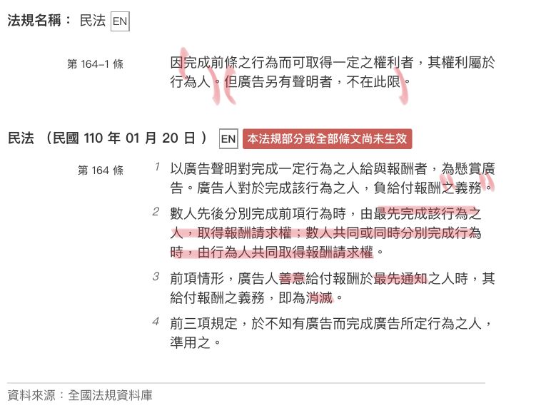 民法第164條之1 (懸賞廣告權利之歸屬)
