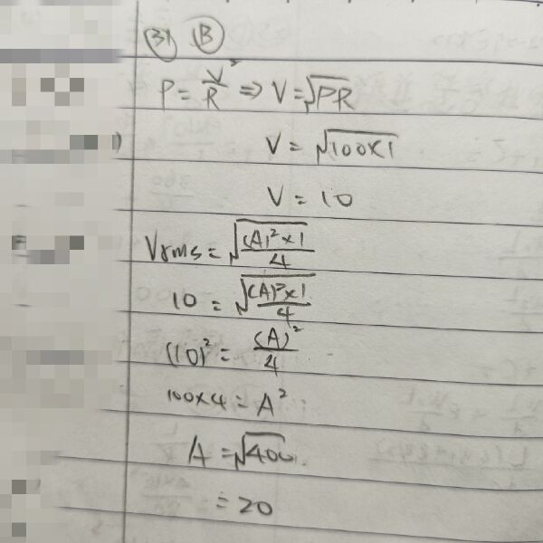 31 下列將左圖之電壓源,供給至右圖之電路,如負載之功率為 100W,求 A 之值為何?