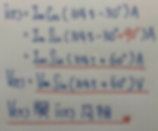 31.某交流電源測得瞬時線電壓為 v(t)=Vm sin(314t+60°) V,瞬時線電流 i(t)=Im cos(314t-30°) A,請問 v(t)與 i(t)之 相位關係何者正確?