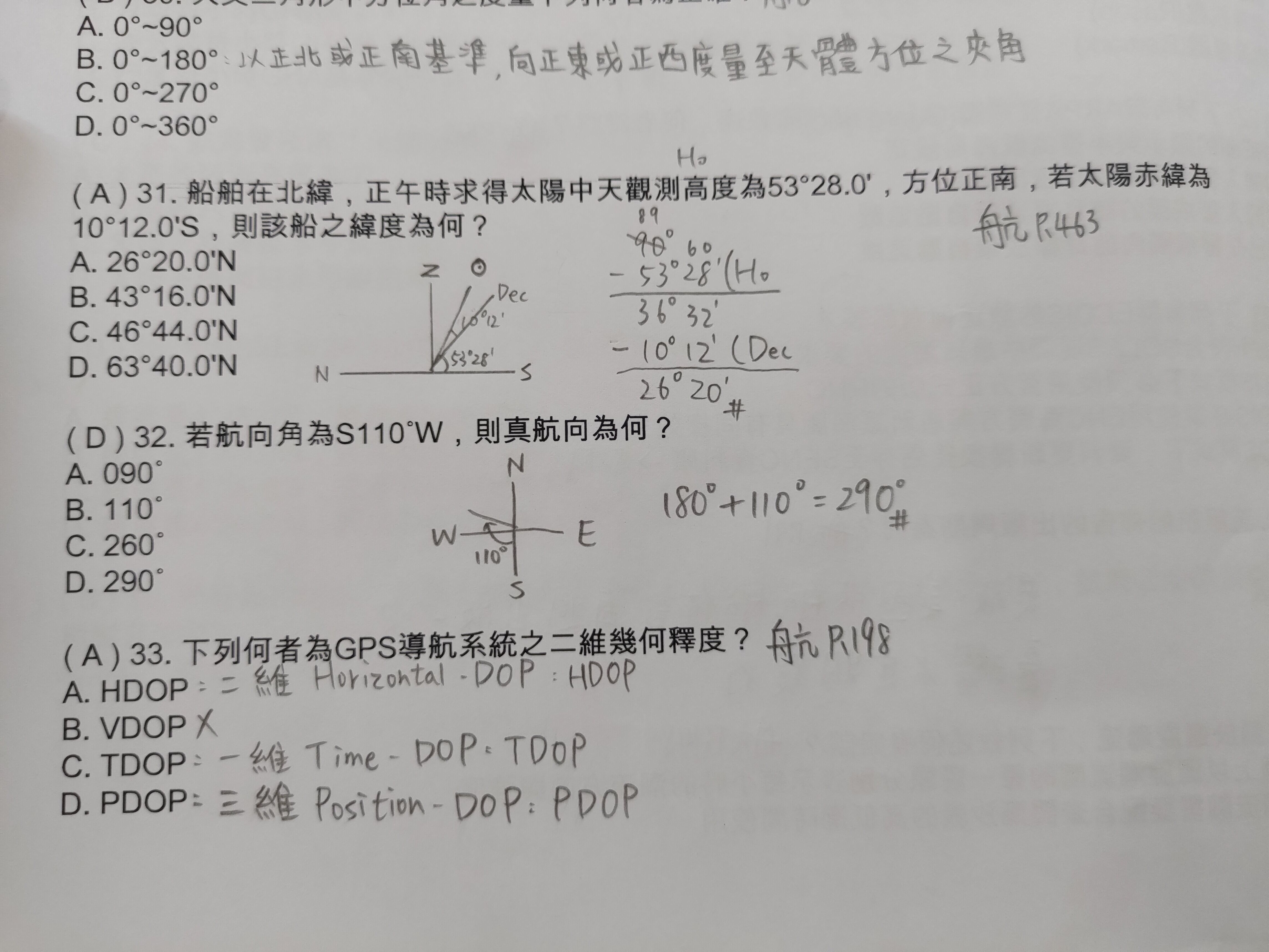 31. 船舶在北緯,正午時求得太陽中天觀測高度為53°28.0',方位正南,若太陽赤緯為