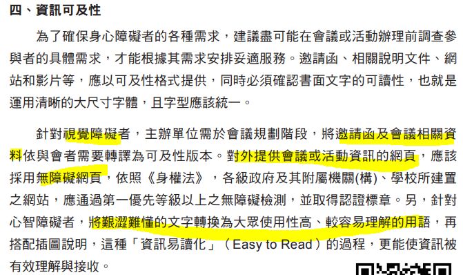 1. 各級機關、學校辦理身心障礙者融合式會議及活動時,為了確保身心障礙者的參與無礙,下