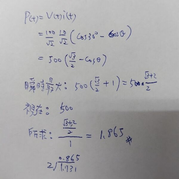 35有一交流電路之電壓 v(t)=100sin(377t-20°)V、電流 i(t)=10sin(377t+10°)A,則其瞬時功率最大值與視