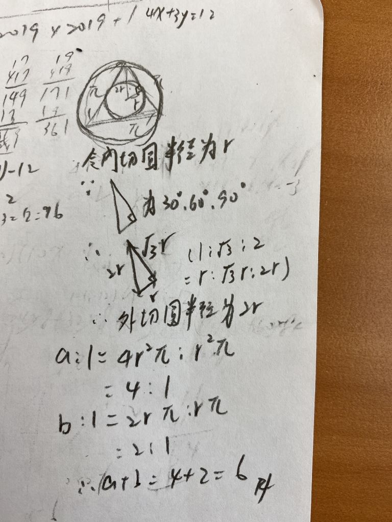 32、邊長為 π 之正三角形,若令其「外接圓的面積:內切圓的面積=a:1」,且「外接圓的周長:內切圓的周長=b:1」,則 a+b=?