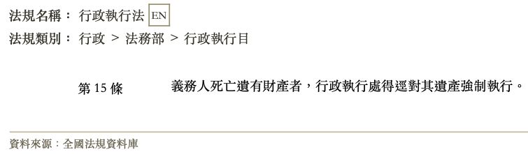 | 行政執行法第十五條規定:「義務人死亡遺有財產者,行政執行處得逕對其遺產強制執行」,係就負有公法上金錢給付義務之人死亡後,行政執行處應如何強制執行,所為之特別規定。罰鍰乃公法上金錢給付義務之一種,罰鍰之處分作成而具執行力後,義務人死亡並遺有財產者,依上開行政執行法第十五條規定意旨,該基於罰鍰處分所發生之公法上金錢給付義務,得為強制執行,其執行標的限於義務人之遺產。 |