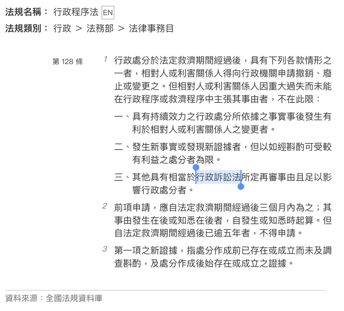 行政處分於法定救濟期間經過後,具有下列各款情形之一者,相對人或利害關係人得向行政機關申請撤銷、廢止或變更之。但相對人或利害關係人因重大過失而未能在行政程序或救濟程序中主張其事由者,不在此限: