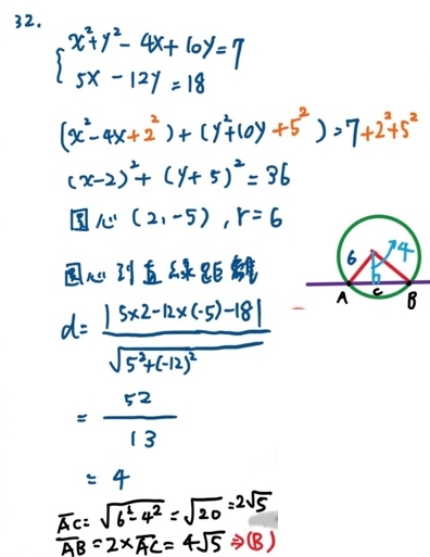 32.坐標平面上圓 C:x 2 + y 2 − 4x + 10y = 7與直線 L:5x − 12y = 18相交於 A、B 兩點,求