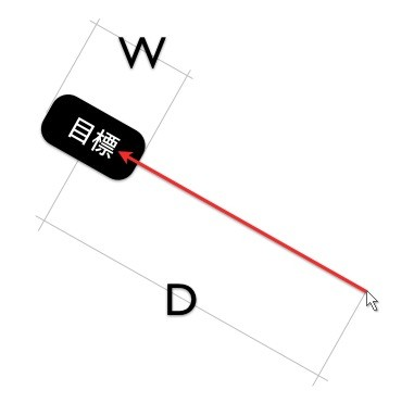 其中 T 代表所花費的時間,a 是系統一定會花費的時間,b 是系統速率,D 代表啟始點到目標之間的距離,而 W 則是目標物平行於運動軌跡的長度。看起來一點都不討喜,對吧?我們可以用下圖來簡化一下費茲定律的意思: