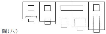 32. Joe建築師執行一棟位於嘉義的私人藝廊設計案,依據俯視圖(八)提出四個前視圖方案, 並以陰影表達造型的凹凸。下列何者不符合俯視圖的條件?