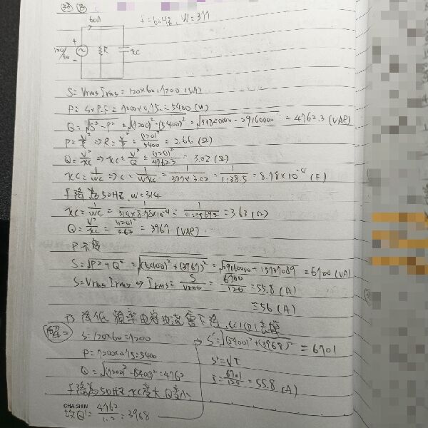 33 一個負載由電容與電阻並聯組成,在 120 V/60 Hz 的電源之下的功率因數為 0.75,量得的電流為 60 A。 若將電源頻率降為 50 Hz,電流約變為多少?