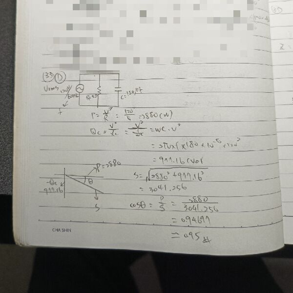 因為RC並聯 所以實部部分會拿到電抗值部分(平方和差會有j*(-j)=1) 所以答案會是 cos(tan-1(Rc/Xc))